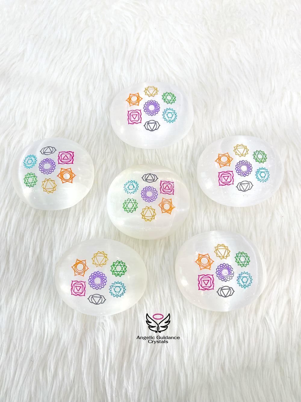 Selenite Seven Chakra Engraved Palmstone
