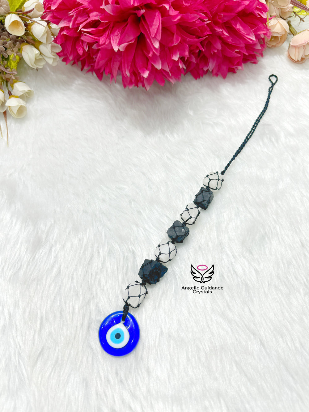 - This Black Tourmaline and Selenite hanging is the ultimate protection for your space. The combination of these two powerful crystals work together to repel negativity and promote positive energy. The addition of the evil eye provides extra security and peace of mind. Experience the benefits of this dynamic trio in your home or office.